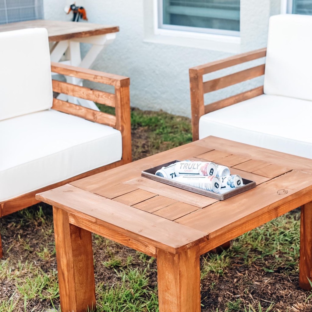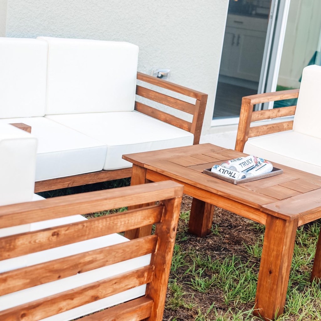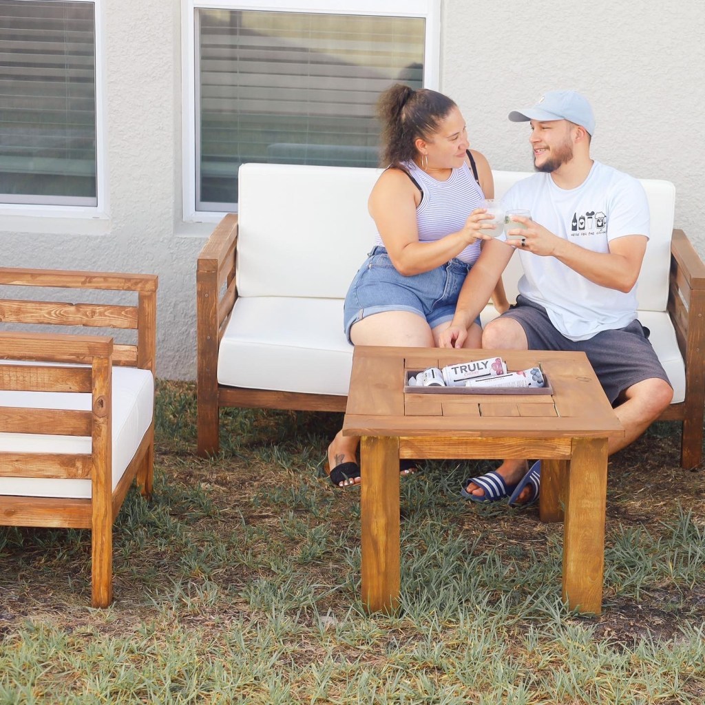 After figuring our what tutorial I was going to use, I headed to our local Homedpot and Lowes and got all the lumber and materials. I spent about $120 on all the lumber and materials needed. The chairs and couch were super easy to build, but I did need the help of my husband using the Brad Nailer. I’m so glad he taught me! I am now ready to take on some more difficult projects.